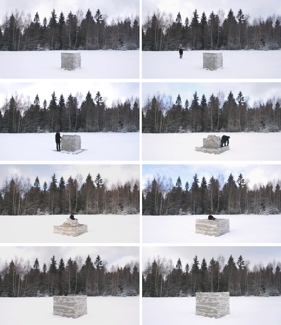 In dem Video, "The Scene Behind", betritt der Künstler, aus dem Wald im Bildhintergrund kommend, eine schneebedeckte weiße Fläche und geht zu einer Palette mit Kalksandsteinen. Gleichmäßig nimmt er Stein für Stein vom Stapel und "mauert" damit einen quadratischen Kubus um sich herum, bis das er nicht mehr sichtbar und im Inneren verschwunden ist. Neben dem Erschaffen der eigenen vier Wände, einem Schutz- und Rückzugsort, kann sich der Raum in eine klaustrophobische Zelle, einen Ort der Gefangenschaft wandeln.